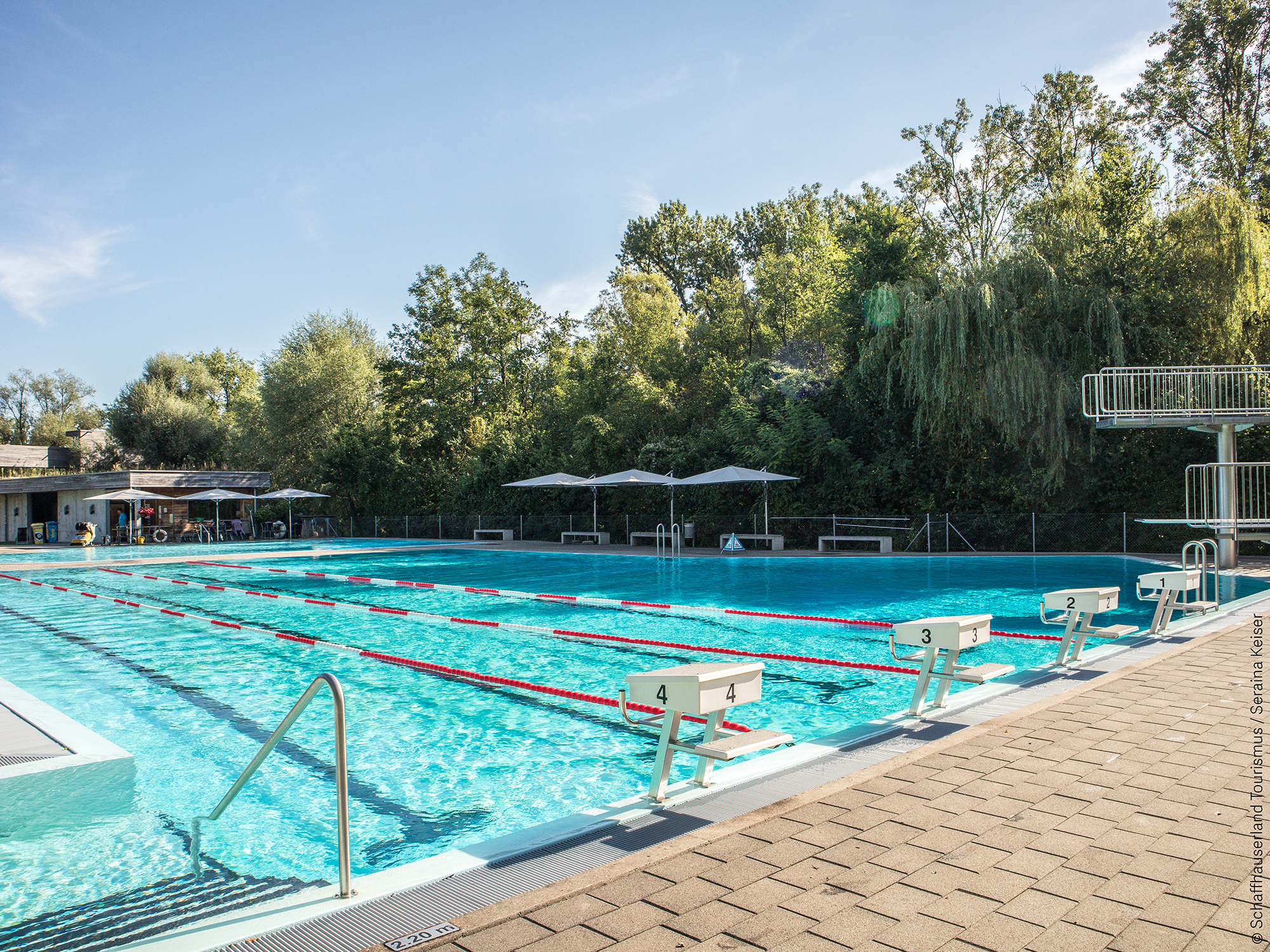 Auf dem gleichen Gelände wie das Naturzentrum Thurauen bietet die Badi Flaach ein 25 Meter langes Schwimmbecken mit Sprungturm, ein Kinderplanschbecken mit Wasserrutsche und Sonnensegel sowie grosszügige Liegewiesen direkt am Rhein.